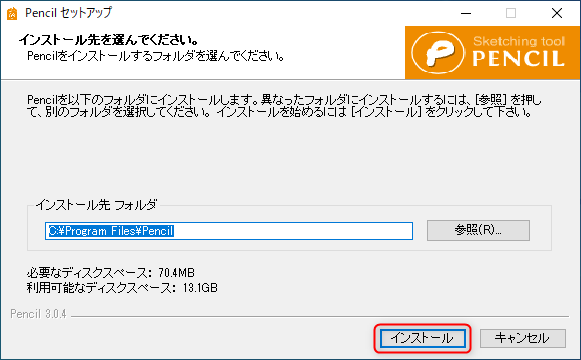 ダウンロードしたファイルを開くと、Pencilのインストーラーが起動します。