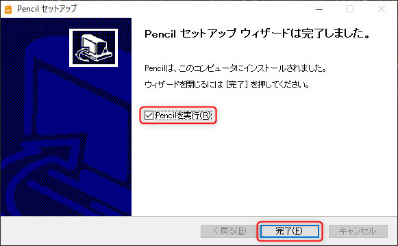 「Pencilを実行」にチェックを入れた状態で「完了」ボタンをクリックします。