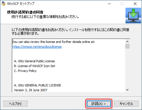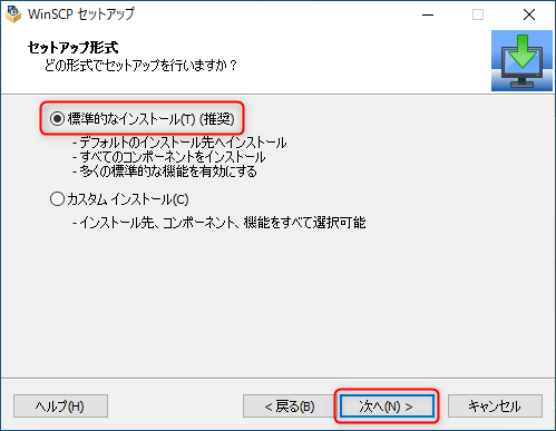 ダウンロードしたファイルを開くと、WinSCPのインストーラーが起動します。