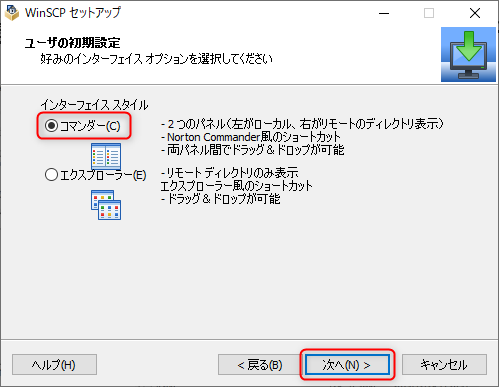 コマンダー」にチェックが入っていることを確認し、「次へ」ボタンをクリックします。