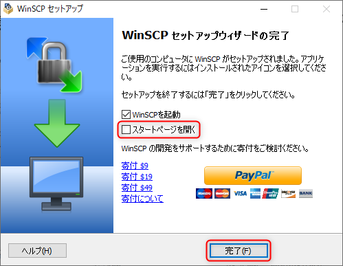 スタートページを開く」からチェックを外し、「完了」ボタンをクリックします。